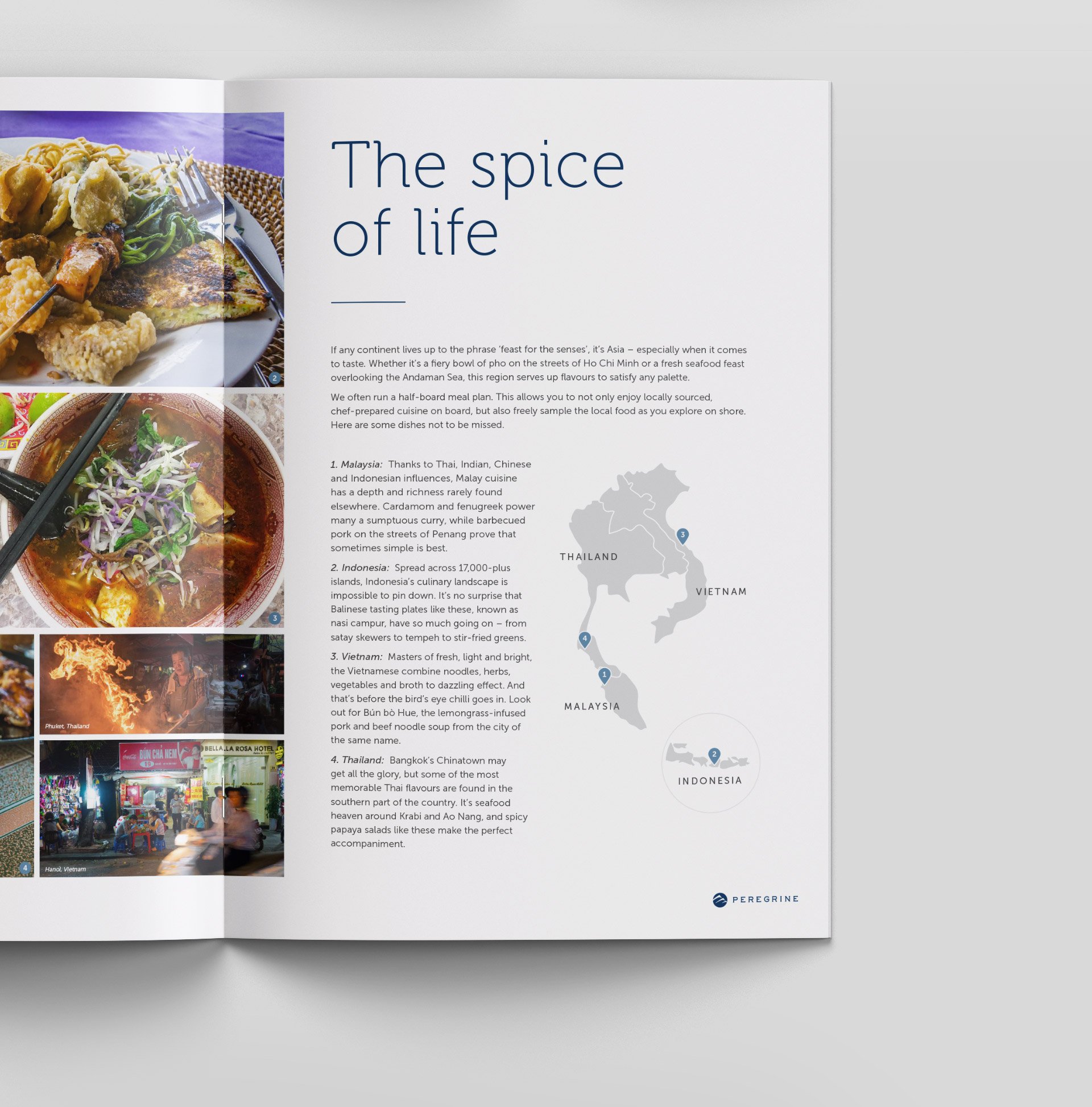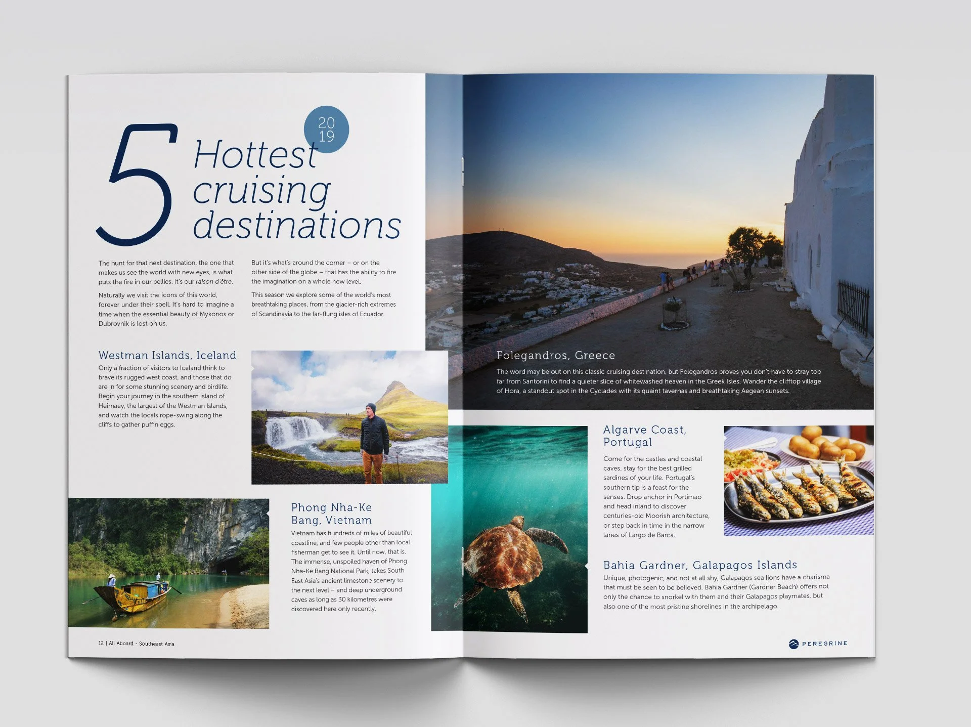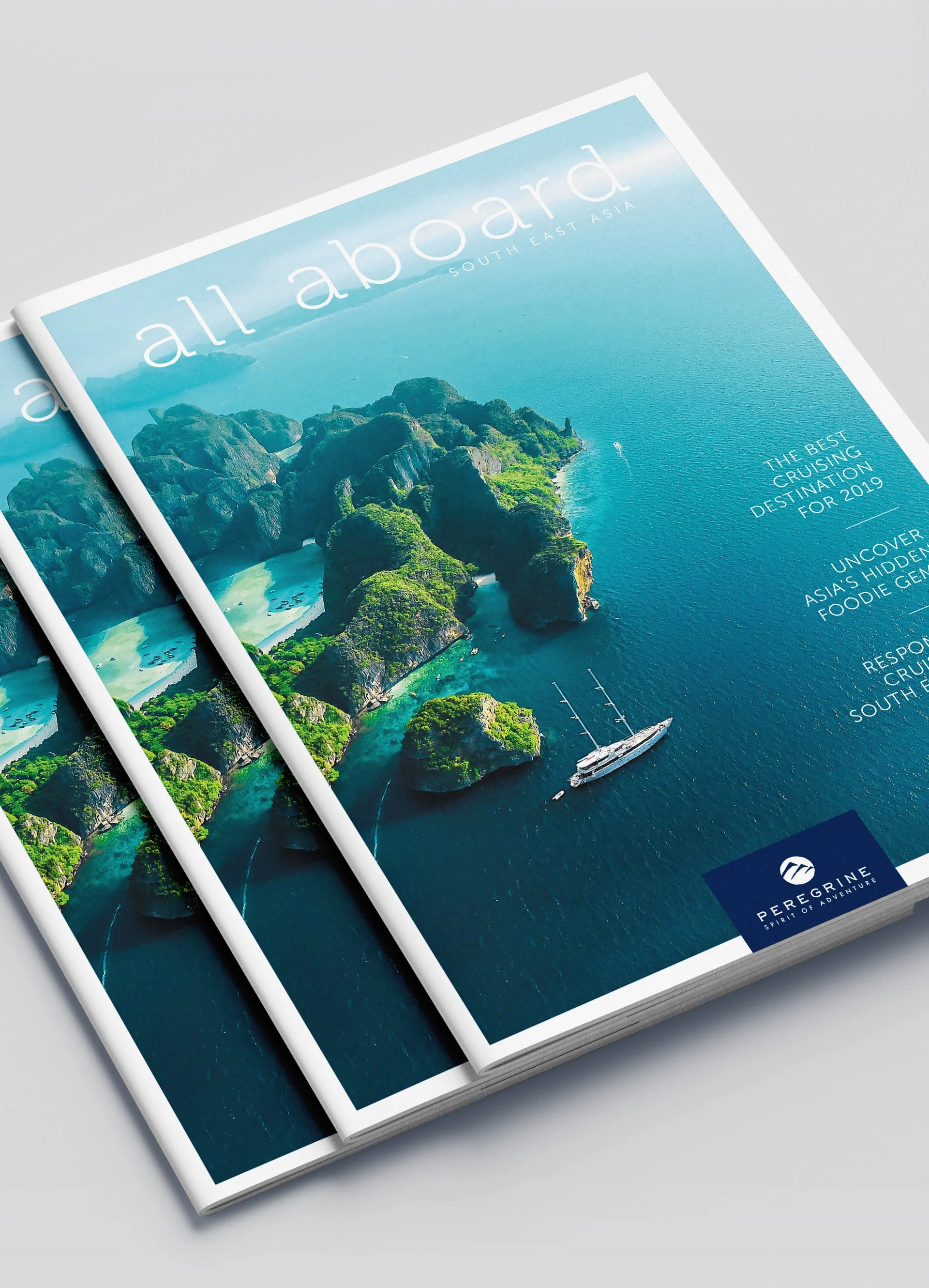 Peregrine Adventures had introduced a new line of premium Adventure Cruises, designed for adventurous travellers aged 50+ looking to combine the experience of premium cruising with the benefits of small group tours. ‘All Aboard’ was a custom magazine delivered to guest cabins and designed to help them while away the days lounging on the deck. Inside was packed with travel inspiration, stories, advice and interviews.